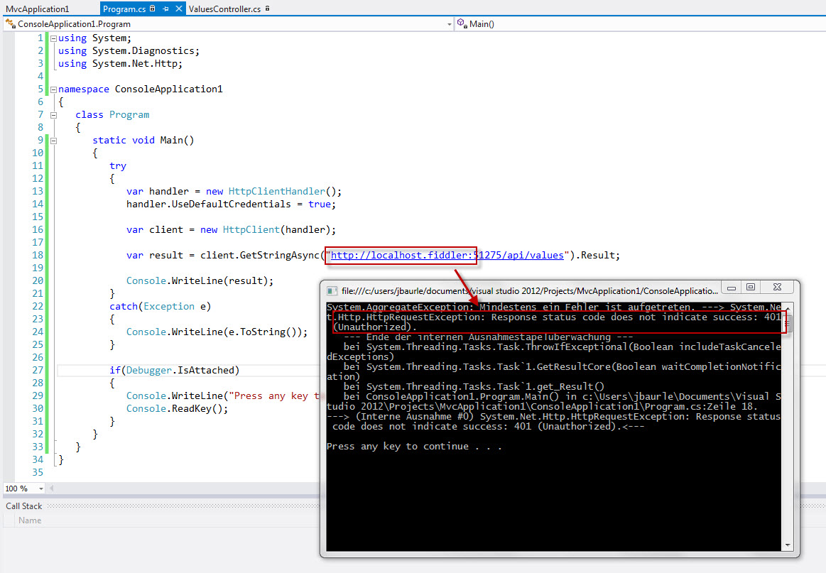 You can easily reproduce this error by creating a standard MVC4 web application with a Web API controller using windows authentication (see screenshot for settings). Then you add a console application to the project from which access the REST API (ValuesController).