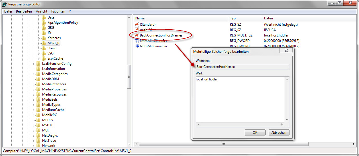 So, the solution is quite simple. We just need to add the registry key BackConnectionHostNames (important: Multi-Value String) to HKEY_LOCAL_MACHINE\SYSTEM\CurrentControlSet\ Control\Lsa\MSV1_0 section in the registry with the value localhost.fiddler. A full explanation about the security concepts in WIA you will find at Microsoft’s site: Changes to NTLM authentication for HTTPWebRequest in Version 3.5 SP1
